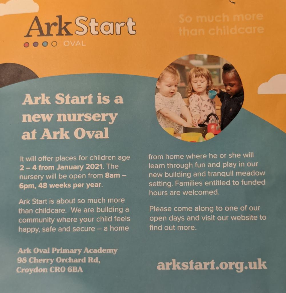 Ark Start Oval nursery info Dec 8, 2020 · by eastcroydon · in Family & Education. · For more information see the website: Homepage Share this: Share on X (Opens in new window) X Share on Facebook (Opens in new window) Facebook Share on Bluesky (Opens in new window) Bluesky Share on Nextdoor (Opens in new window) Nextdoor Like Loading... Related