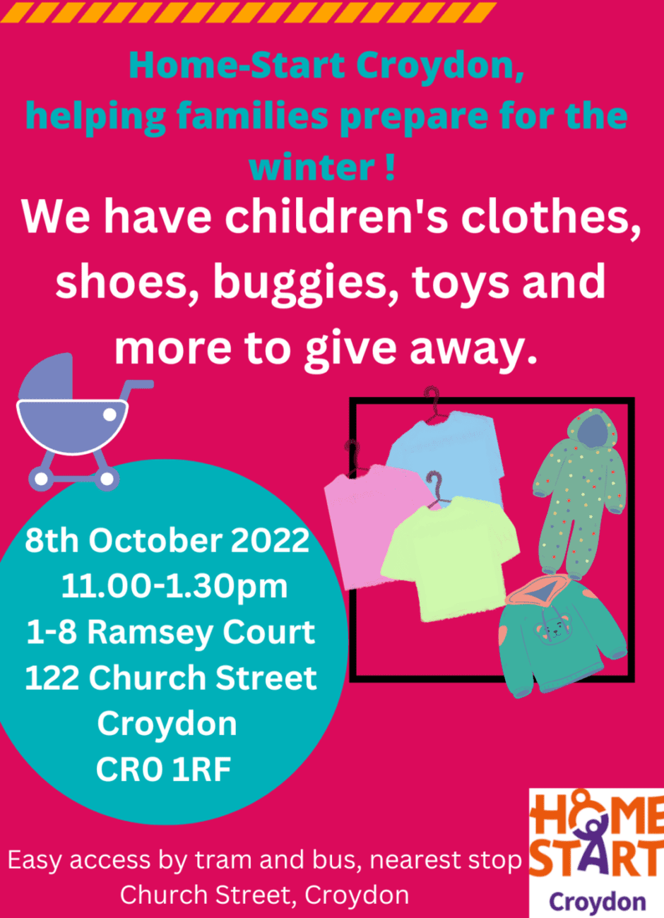 Free children’s clothes & toys at Home-Start Croydon, 11am-1.30pm Saturday 8 October Oct 7, 2022 · by eastcroydon · in Family & Education, Uncategorized. · A short walk from the ECCO area. Click here for more information https://croydon-homestart.co.uk Share this: Share on X (Opens in new window) X Share on Facebook (Opens in new window) Facebook Share on Bluesky (Opens in new window) Bluesky Share on Nextdoor (Opens in new window) Nextdoor Like Loading... Related