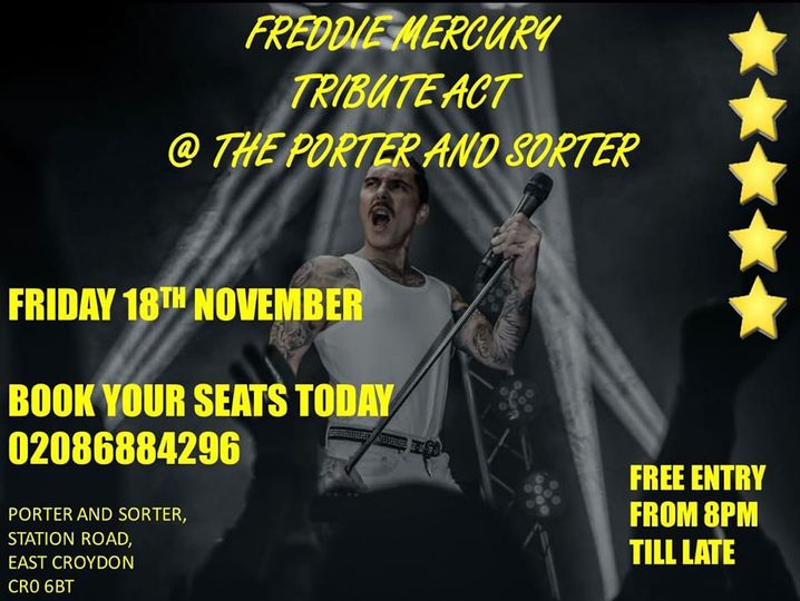 Freddie Mercury tribute act, 8pm Friday 18 November at The Porter & Sorter, next to East Croydon Station Nov 17, 2022 · by eastcroydon · in Sport & Leisure. · Share this: Click to share on X (Opens in new window) X Click to share on Facebook (Opens in new window) Facebook Click to share on Bluesky (Opens in new window) Bluesky Click to share on Nextdoor (Opens in new window) Nextdoor Like Loading... Related