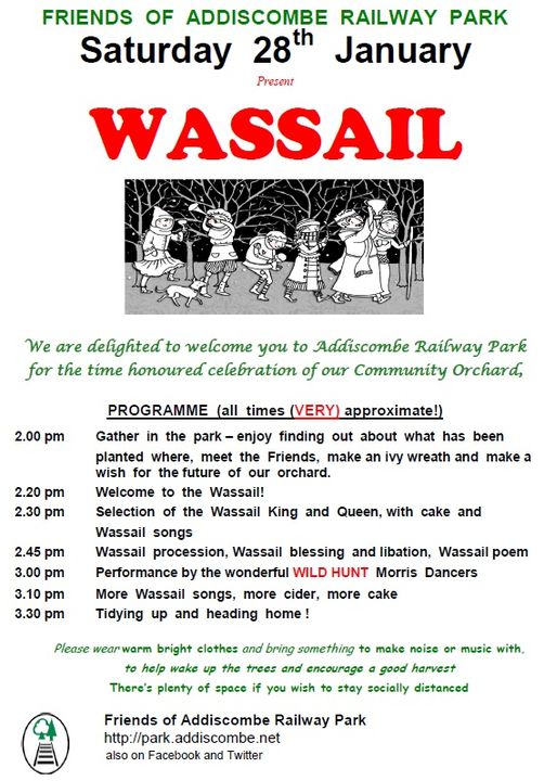 Wassail in Addiscombe Railway Park, 2 – 3.30pm on Saturday 28 January @AddiscombePark @LloydParkCR0 @ParkHillFriends @AshburtonPark Jan 27, 2023 · by eastcroydon · in Environment & Recycling, Sport & Leisure. · Share this: Click to share on X (Opens in new window) X Click to share on Facebook (Opens in new window) Facebook Click to share on Bluesky (Opens in new window) Bluesky Click to share on Nextdoor (Opens in new window) Nextdoor Like Loading... Related