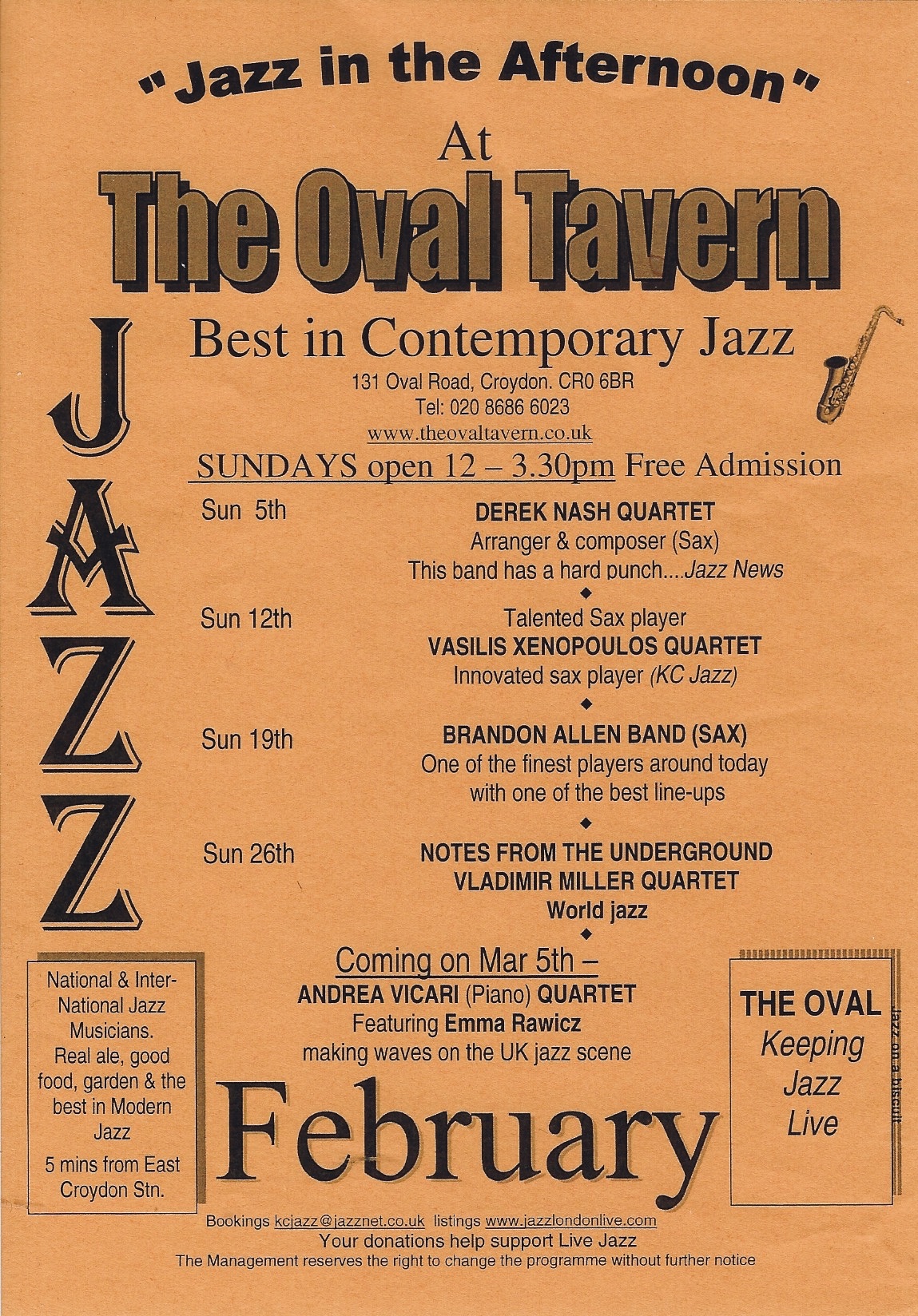 FREE Jazz 12 – 3.30pm on Sundays @TheOvalTavern Feb 3, 2023 · by eastcroydon · in Sport & Leisure. · Share this: Click to share on X (Opens in new window) X Click to share on Facebook (Opens in new window) Facebook Click to share on Bluesky (Opens in new window) Bluesky Click to share on Nextdoor (Opens in new window) Nextdoor Like Loading... Related