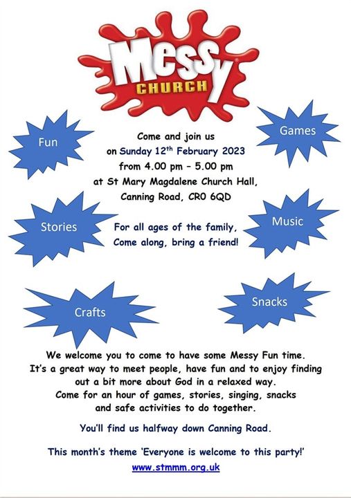 Messy Church 4 – 5 pm Sunday, 12 February at St Mary Magdalene Church Hall, Canning Road @StMMMCroydon Feb 11, 2023 · by eastcroydon · in Faith & Charity, Sport & Leisure. · Share this: Click to share on X (Opens in new window) X Click to share on Facebook (Opens in new window) Facebook Click to share on Bluesky (Opens in new window) Bluesky Click to share on Nextdoor (Opens in new window) Nextdoor Like Loading... Related