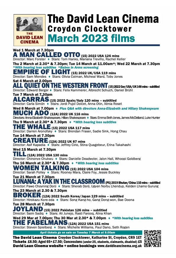 March films at the David Lean Cinema, Katharine St @SaveDavidLean Feb 28, 2023 · by eastcroydon · in Sport & Leisure. · Share this: Click to share on X (Opens in new window) X Click to share on Facebook (Opens in new window) Facebook Click to share on Bluesky (Opens in new window) Bluesky Click to share on Nextdoor (Opens in new window) Nextdoor Like Loading... Related