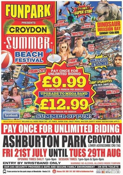 Summer Beach Festival 1 – 9pm Friday, 21 to Tuesday, 29 July 2023 @AshburtonPark Jul 18, 2023 · by eastcroydon · in Sport & Leisure. · Share this: Click to share on X (Opens in new window) X Click to share on Facebook (Opens in new window) Facebook Click to share on Bluesky (Opens in new window) Bluesky Click to share on Nextdoor (Opens in new window) Nextdoor Like Loading... Related
