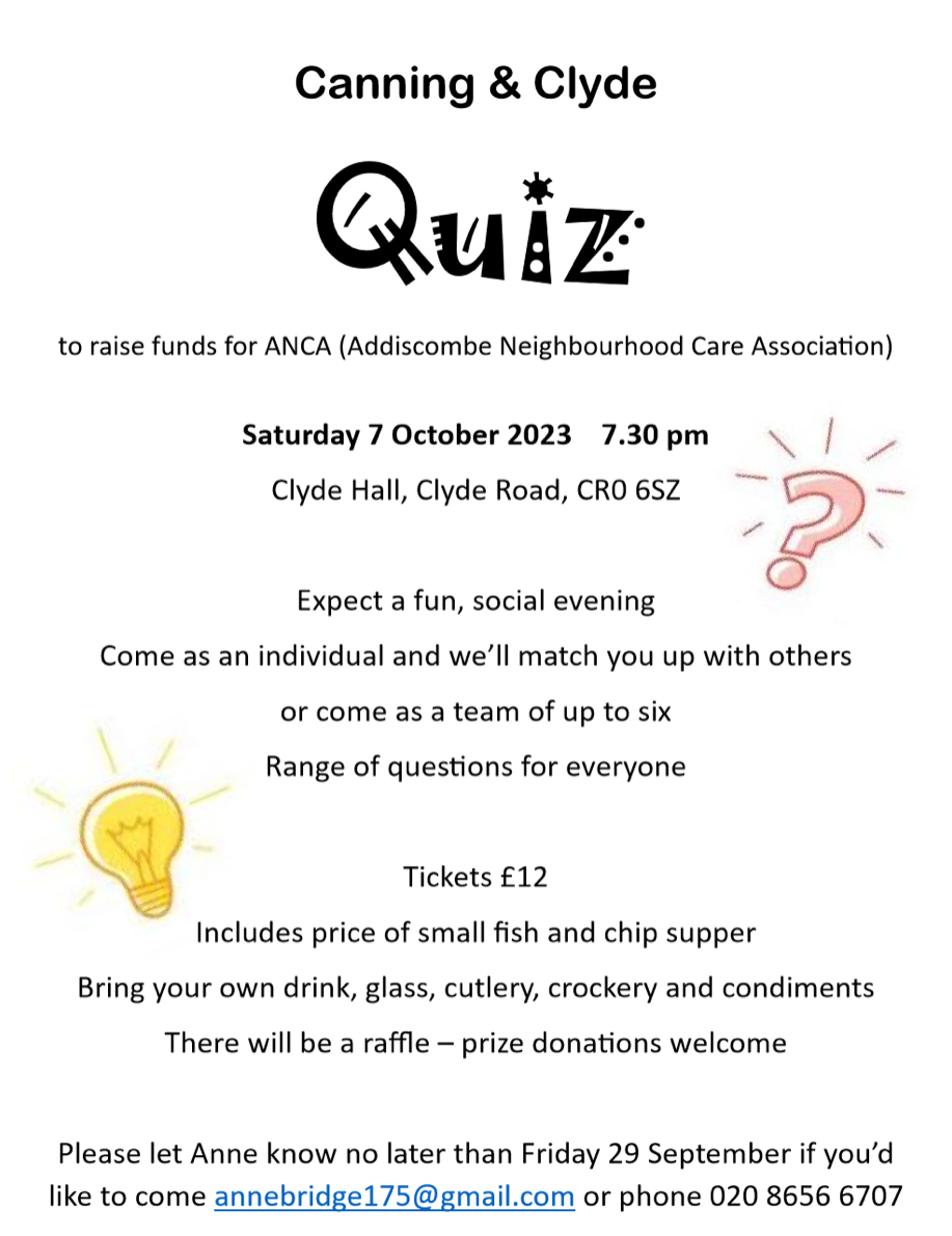 Canning & Clyde Quiz 7.30pm Saturday, 7 October in Clyde Hall, Clyde Road Sep 15, 2023 · by eastcroydon · in Faith & Charity, Sport & Leisure. · Share this: Share on X (Opens in new window) X Share on Facebook (Opens in new window) Facebook Share on Bluesky (Opens in new window) Bluesky Share on Nextdoor (Opens in new window) Nextdoor Like Loading... Related