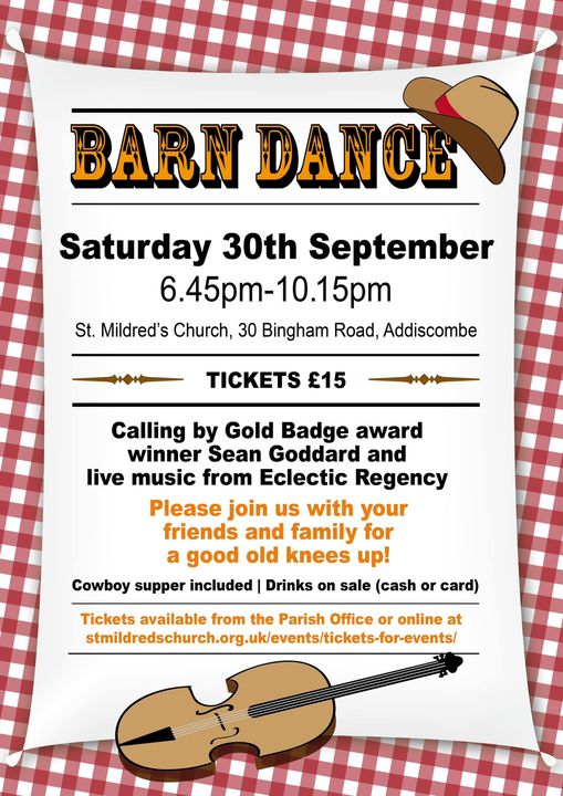 Barn Dance 6.45pm Saturday, 30 September at St Mildred’s Church, 30 Bingham Road @milliescroydon Sep 28, 2023 · by eastcroydon · in Sport & Leisure. · £15. Click here to buy tickets https://stmildredschurch.org.uk/events/tickets-for-events/ Share this: Share on X (Opens in new window) X Share on Facebook (Opens in new window) Facebook Share on Bluesky (Opens in new window) Bluesky Share on Nextdoor (Opens in new window) Nextdoor Like Loading... Related