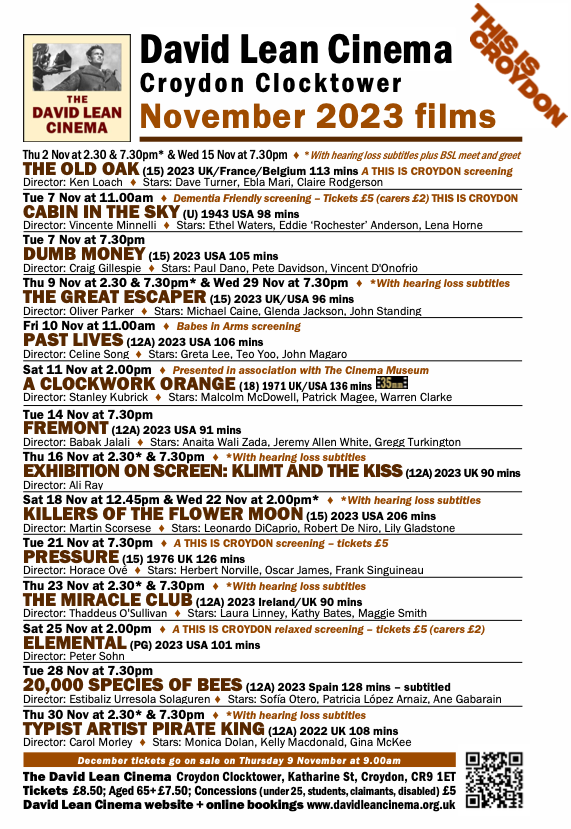 November films at the David Lean Cinema, Croydon Clocktower, Katharine Street @SaveDavidLean @RuskinCroydon Oct 30, 2023 · by eastcroydon · in Sport & Leisure. · Click here to book tickets https://www.davidleancinema.org.uk Share this: Click to share on X (Opens in new window) X Click to share on Facebook (Opens in new window) Facebook Click to share on Bluesky (Opens in new window) Bluesky Click to share on Nextdoor (Opens in new window) Nextdoor Like Loading... Related