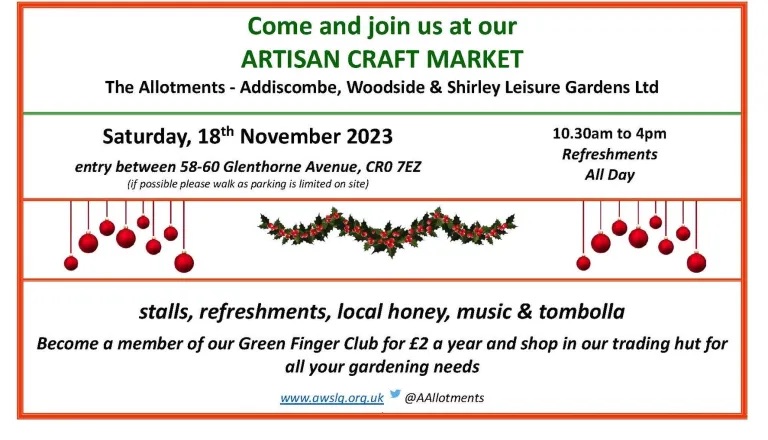 Craft market 10.30am – 4pm Saturday, 18 November at The Allotments, 58-60 Glenthorne Avenue @AAllotments Nov 16, 2023 · by eastcroydon · in Shopping & Take-aways. · Share this: Click to share on X (Opens in new window) X Click to share on Facebook (Opens in new window) Facebook Click to share on Bluesky (Opens in new window) Bluesky Click to share on Nextdoor (Opens in new window) Nextdoor Like Loading... Related