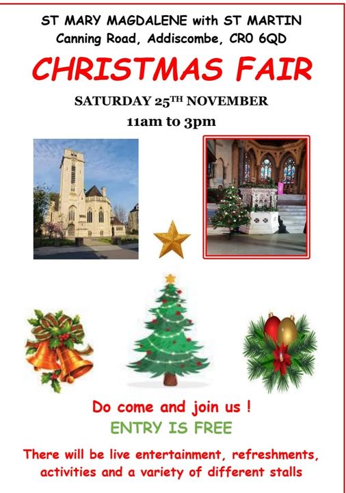 Christmas Fair 11am-3pm, Saturday 25 November at St Mary Magdalene, Canning Road @St MMMCroydon Nov 20, 2023 · by eastcroydon · in Shopping & Take-aways, Sport & Leisure. · Share this: Click to share on X (Opens in new window) X Click to share on Facebook (Opens in new window) Facebook Click to share on Bluesky (Opens in new window) Bluesky Click to share on Nextdoor (Opens in new window) Nextdoor Like Loading... Related