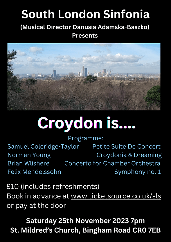 Coleridge-Taylor, Young, Wilshere & Mendelssohn 7pm Saturday, 25 November at St Mildred’s, Bingham Road @SLondonSinfonia @CroydOrch @croydonphil @SurreyOpera @milliescroydon Nov 21, 2023 · by eastcroydon · in Sport & Leisure. · Click here for more information about the South London Sinfonia https://www.southlondonsinfonia.co.uk Share this: Click to share on X (Opens in new window) X Click to share on Facebook (Opens in new window) Facebook Click to share on Bluesky (Opens in new window) Bluesky Click to share on Nextdoor (Opens in new window) Nextdoor Like Loading... Related