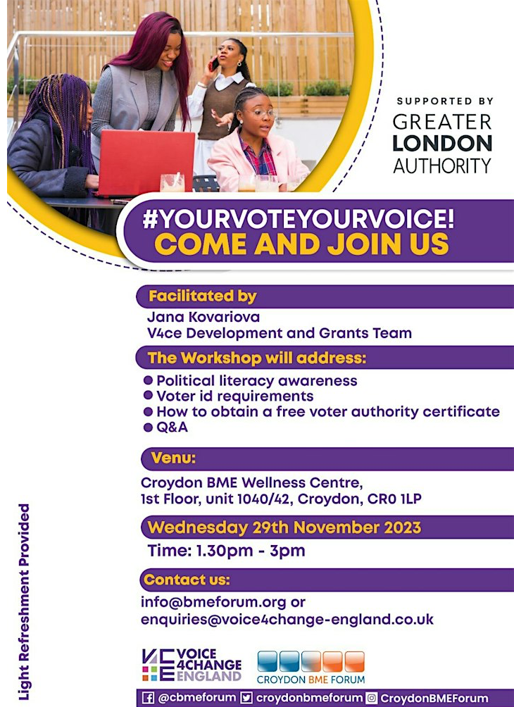 Click here for more information and to reserve your place https://www.eventbrite.co.uk/e/political-literacy-yourvoteyourvoice-tickets-760091994617?aff=oddtdtcreator&fbclid=IwAR2DHypgnEX8_i2UGpZYRvlvz6Mq70KROqr3Toz4ztOP8LvcRJRGrD0Bu74