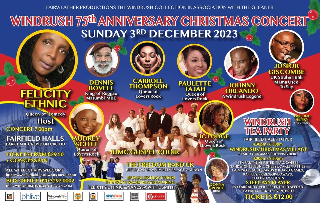 Windrush 75th Anniversary Christmas Concert 7pm to 10pm Hosted by Felicity EthnicStarring Carroll Thompson, Junior Giscombe, Johnny Orlando, IDMC Gospel Choir, Dennis Bovell / Matumbi , Paulette Tajah, J C Lodge, Shaniqua Benjamin, Audrey Scott and Pauline Henry. The Freedom Band with Bluebeat, Ska, Jim Reeves and Ace Cannon. Plus an extract from The Front Room Play with Vanessa White Smith & Felicity Ethnic. Plus Mr Rudolph Walker, Eastenders.
