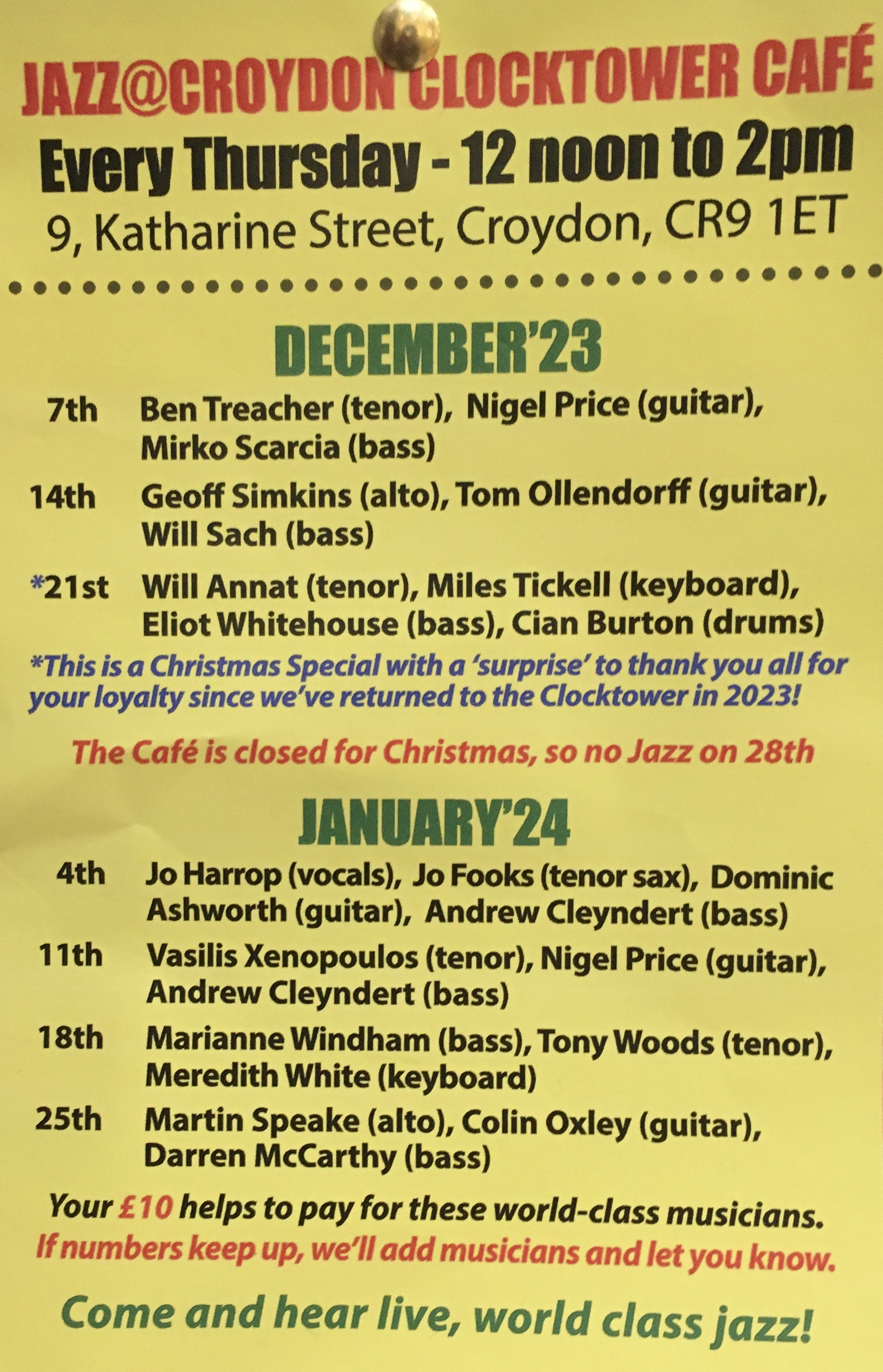 Jazz 12- 2pm Thursdays in December & January at Croydon Clocktower Cafe, Katharine Street @MuseumofCroydon @CroydonLibs Dec 7, 2023 · by eastcroydon · in Sport & Leisure. · Share this: Click to share on X (Opens in new window) X Click to share on Facebook (Opens in new window) Facebook Click to share on Bluesky (Opens in new window) Bluesky Click to share on Nextdoor (Opens in new window) Nextdoor Like Loading... Related