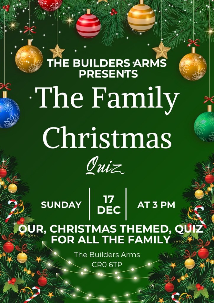 Family Christmas Quiz 3pm Sunday, 17 December at The Builders Arms, 65 Leslie Parks Road @builders_arms Dec 15, 2023 · by eastcroydon · in Family & Education, Sport & Leisure. · Share this: Click to share on X (Opens in new window) X Click to share on Facebook (Opens in new window) Facebook Click to share on Bluesky (Opens in new window) Bluesky Click to share on Nextdoor (Opens in new window) Nextdoor Like Loading... Related