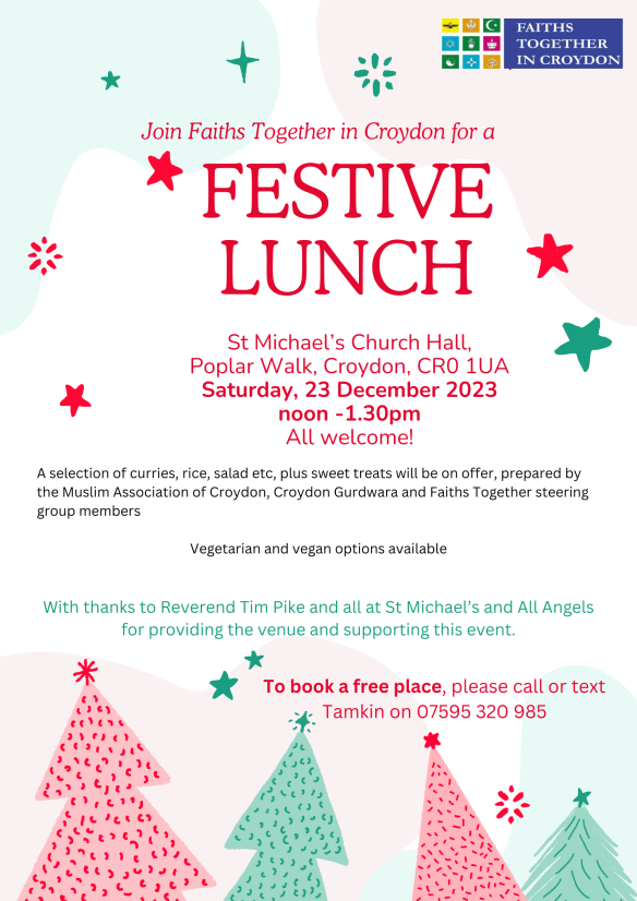 Free Christmas Lunch 12 – 1.30pm, Saturday 23 December in St Michael’s Church Hall, Poplar Walk, West Croydon @FTiCroydon Dec 19, 2023 · by eastcroydon · in Faith & Charity. · Share this: Click to share on X (Opens in new window) X Click to share on Facebook (Opens in new window) Facebook Click to share on Bluesky (Opens in new window) Bluesky Click to share on Nextdoor (Opens in new window) Nextdoor Like Loading... Related