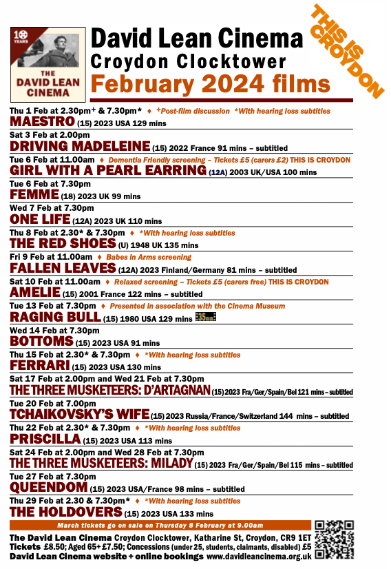 February films at the David Lean Cinema, Katharine Street @SaveDavidLean @CroydonLibs @MuseumofCroydon #Croydon Jan 31, 2024 · by eastcroydon · in Sport & Leisure. · Share this: Click to share on X (Opens in new window) X Click to share on Facebook (Opens in new window) Facebook Click to share on Bluesky (Opens in new window) Bluesky Click to share on Nextdoor (Opens in new window) Nextdoor Like Loading... Related