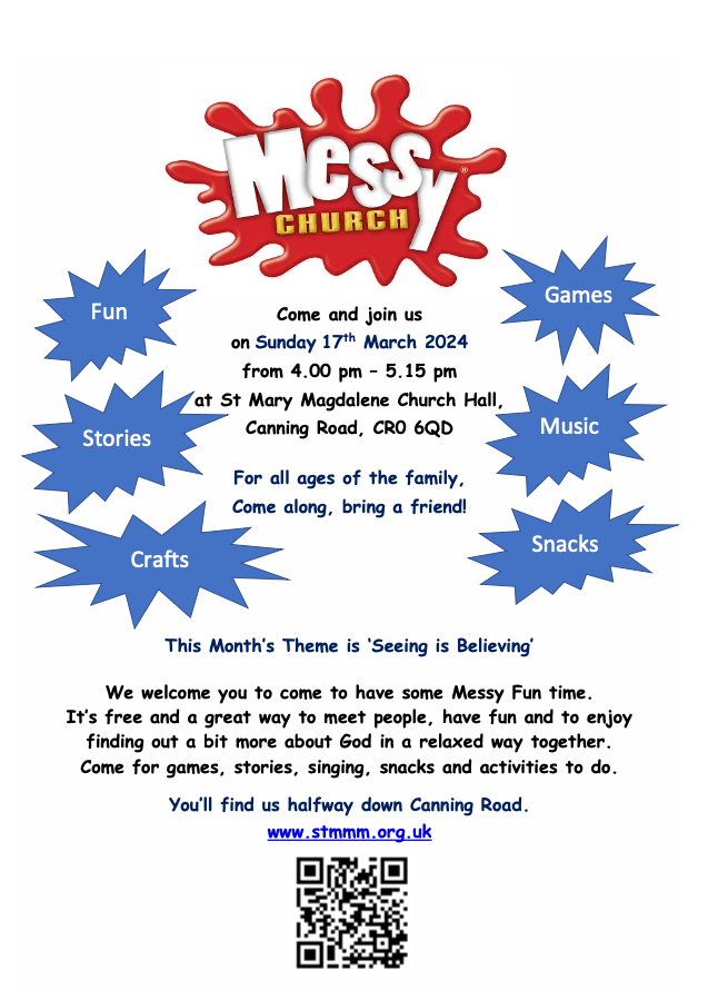 Messy Church 4pm Sunday, 17 March at St Mary Magdalene Church Hall, Canning Road @StMMMCroydon Mar 16, 2024 · by eastcroydon · in Faith & Charity, Family & Education, Sport & Leisure. · Share this: Share on X (Opens in new window) X Share on Facebook (Opens in new window) Facebook Share on Bluesky (Opens in new window) Bluesky Share on Nextdoor (Opens in new window) Nextdoor Like Loading... Related