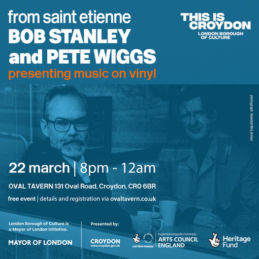 Bob Stanley & Pete Wiggs DJ set 8pm Friday, 22 March@TheOvalTavern @culturecroydon Mar 18, 2024 · by eastcroydon · in Sport & Leisure. · Click here to reserve your FREE place https://www.wegottickets.com/event/612797?fbclid=IwAR2iXnzpo7CS3I_Fc-FiZp1VZVHBhMAFbcSK1NvHNosjUhJaVm2Zl0miIBM&fbclid=IwAR0CC0uWmkWyTw0iCWYpXTHw4BsfsH0tdXqebVk3UBDBFIyf6w96ULjofuQ Share this: Click to share on X (Opens in new window) X Click to share on Facebook (Opens in new window) Facebook Click to share on Bluesky (Opens in new window) Bluesky Click to share on Nextdoor (Opens in new window) Nextdoor Like Loading... Related