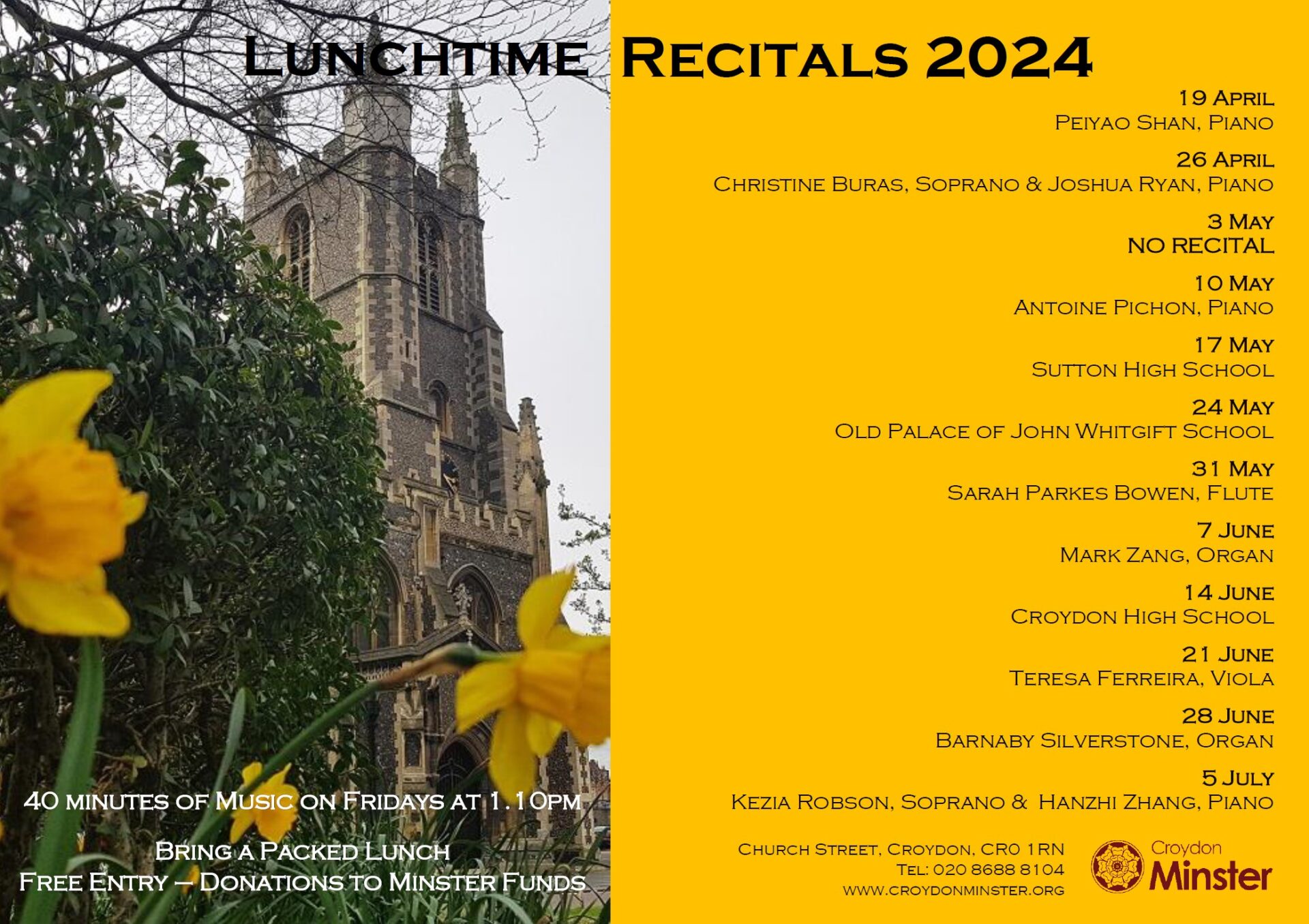 Lunchtime recitals 1.10pm Fridays 19 April to 5 July at Croydon Minster, Church Street @croydonminster Apr 17, 2024 · by eastcroydon · in Faith & Charity, Sport & Leisure, Uncategorized. · Share this: Click to share on X (Opens in new window) X Click to share on Facebook (Opens in new window) Facebook Click to share on Bluesky (Opens in new window) Bluesky Click to share on Nextdoor (Opens in new window) Nextdoor Like Loading... Related