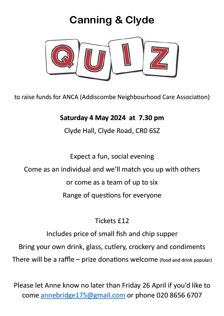 Canning & Clyde Quiz, 7.30pm Saturday, 4 May at Clyde Hall, Clyde Road Apr 21, 2024 · by eastcroydon · in Faith & Charity, Sport & Leisure, Uncategorized. · Click here for more information about Canning & Clyde Resident’s Association https://www.canningandclyde.org Share this: Click to share on X (Opens in new window) X Click to share on Facebook (Opens in new window) Facebook Click to share on Bluesky (Opens in new window) Bluesky Click to share on Nextdoor (Opens in new window) Nextdoor Like Loading... Related