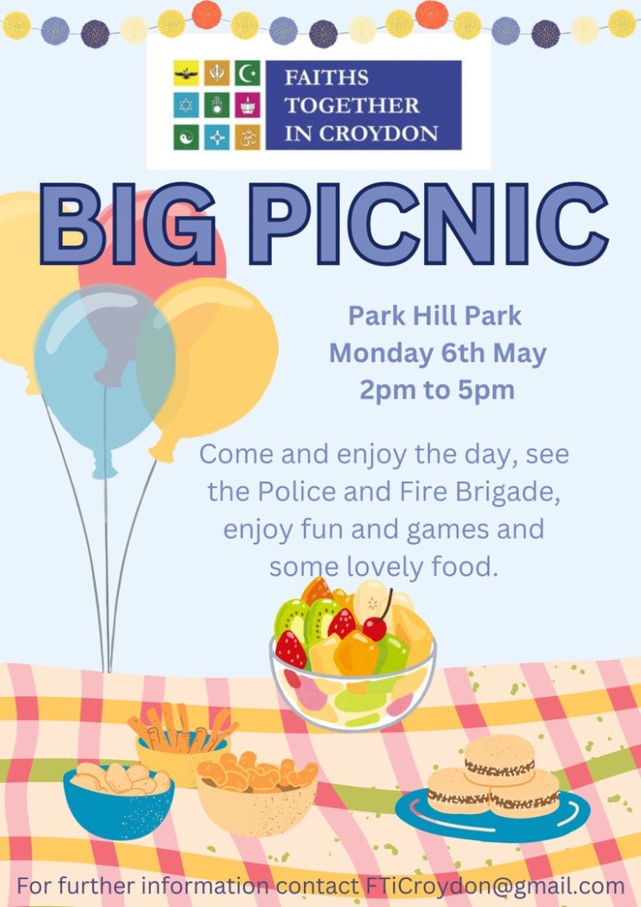 Big Picnic 2-5pm Monday, 6 May in Park Hill Park @FTiCroydon @ParkHillFriends @MPSAddiscombe May 2, 2024 · by eastcroydon · in Faith & Charity, Family & Education, Sport & Leisure. · Click here for more information about Faiths Together in Croydon https://faithstogetherincroydon.org.uk Share this: Click to share on X (Opens in new window) X Click to share on Facebook (Opens in new window) Facebook Click to share on Bluesky (Opens in new window) Bluesky Click to share on Nextdoor (Opens in new window) Nextdoor Like Loading... Related