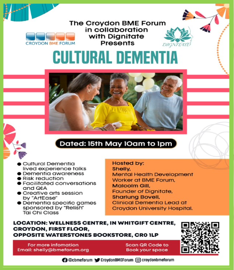 Cultural Dementia session 10am-1pm, Wednesday 15 May at the Wellness Centre, Whitgift Centre (1st floor opposite Waterstones) @CroydonBMEForum @centralewg May 9, 2024 · by eastcroydon · in Family & Education, Health & Beauty. · Click here for more information about The Wellness Centre https://www.cbmeforum.org/the-wellness-centre/ Share this: Click to share on X (Opens in new window) X Click to share on Facebook (Opens in new window) Facebook Click to share on Bluesky (Opens in new window) Bluesky Click to share on Nextdoor (Opens in new window) Nextdoor Like Loading... Related