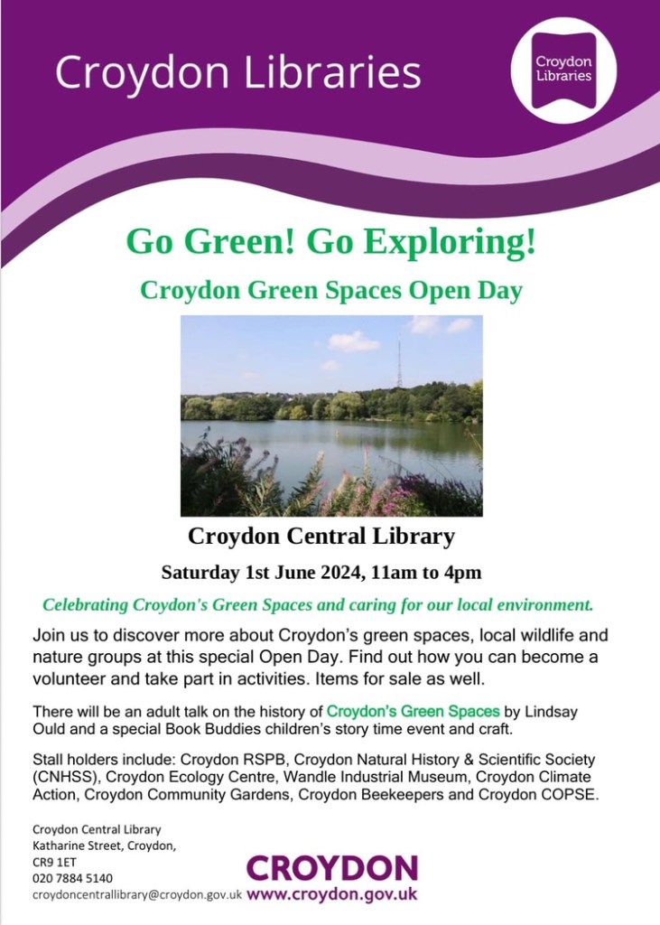 Croydon Green Spaces Day 11am-4pm Saturday, 1 June at Central Library, Katharine Street @CroydonLibs @yourcroydon @cnhssprogramme @CroydonClimateAction @CroydonVA May 28, 2024 · by eastcroydon · in Environment & Recycling, Get Involved. · Share this: Click to share on X (Opens in new window) X Click to share on Facebook (Opens in new window) Facebook Click to share on Bluesky (Opens in new window) Bluesky Click to share on Nextdoor (Opens in new window) Nextdoor Like Loading... Related