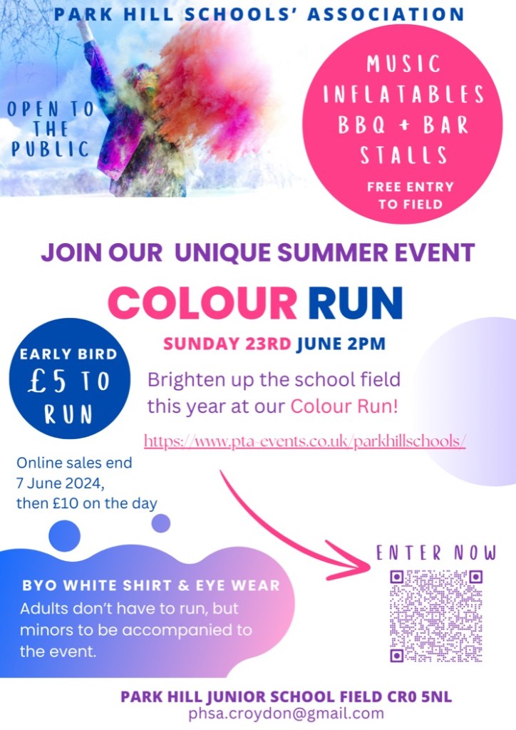 Colour Run 2pm Sunday, 23 June at Park Hill Junior School, Stanhope Road @park_schools Jun 16, 2024 · by eastcroydon · in Family & Education, Sport & Leisure, Uncategorized. · Click here for more information about Park Hills Schools Association https://www.facebook.com/ParkHillSchoolsPHSA Share this: Click to share on X (Opens in new window) X Click to share on Facebook (Opens in new window) Facebook Click to share on Bluesky (Opens in new window) Bluesky Click to share on Nextdoor (Opens in new window) Nextdoor Like Loading... Related