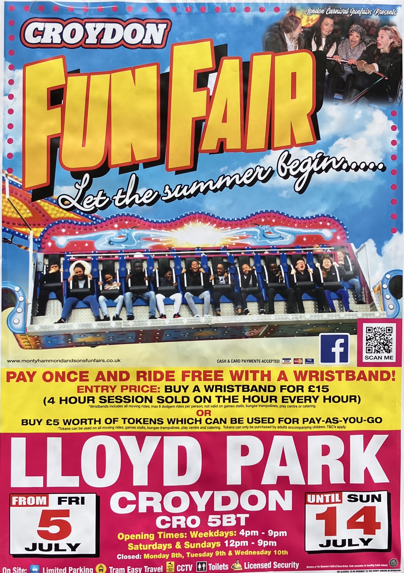 Fun Fair Friday, 5 to Sunday, 14 July in Lloyd Park @LloydParkCR0 Jul 4, 2024 · by eastcroydon · in Sport & Leisure, Uncategorized. · Share this: Click to share on X (Opens in new window) X Click to share on Facebook (Opens in new window) Facebook Click to share on Bluesky (Opens in new window) Bluesky Click to share on Nextdoor (Opens in new window) Nextdoor Like Loading... Related