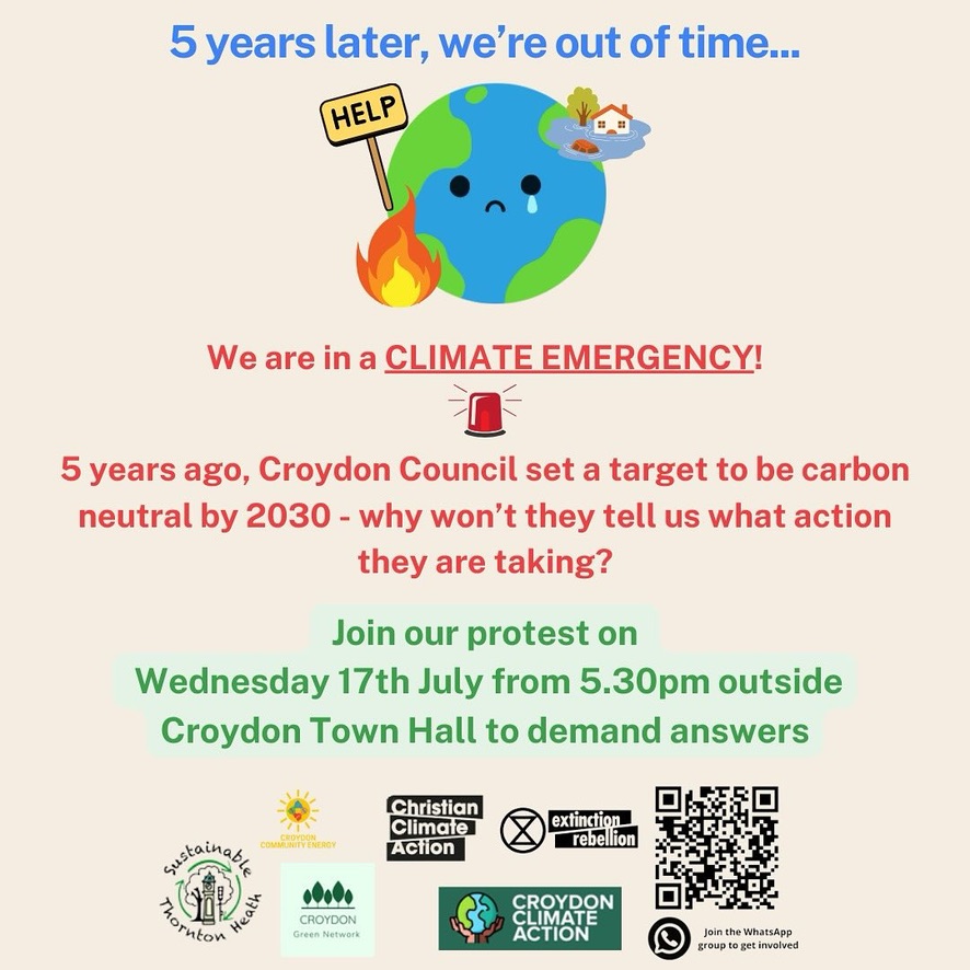 Climate protest 5.30pm Wednesday, 17 July at Croydon Town Hall, Katharine Street @CroydonClimateAction @GreenpeaceCroydon @XRCroydon @yourcroydon Jul 13, 2024 · by eastcroydon · in Environment & Recycling, Get Involved. · Share this: Share on X (Opens in new window) X Share on Facebook (Opens in new window) Facebook Share on Bluesky (Opens in new window) Bluesky Share on Nextdoor (Opens in new window) Nextdoor Like Loading... Related