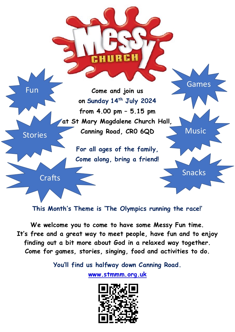 Messy Church 4pm Sunday, 14 July at St Mary Magdalene Church Hall, Canning Road @STMMMCroydon Jul 13, 2024 · by eastcroydon · in Faith & Charity, Sport & Leisure. · Share this: Click to share on X (Opens in new window) X Click to share on Facebook (Opens in new window) Facebook Click to share on Bluesky (Opens in new window) Bluesky Click to share on Nextdoor (Opens in new window) Nextdoor Like Loading... Related