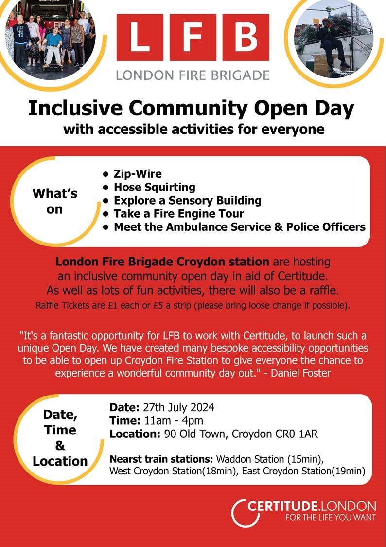 Inclusive open day 11am-4pm Saturday, 27 July at Croydon Fire Station, 90 Old Town Jul 25, 2024 · by eastcroydon · in Family & Education, Sport & Leisure. · Share this: Click to share on X (Opens in new window) X Click to share on Facebook (Opens in new window) Facebook Click to share on Bluesky (Opens in new window) Bluesky Click to share on Nextdoor (Opens in new window) Nextdoor Like Loading... Related