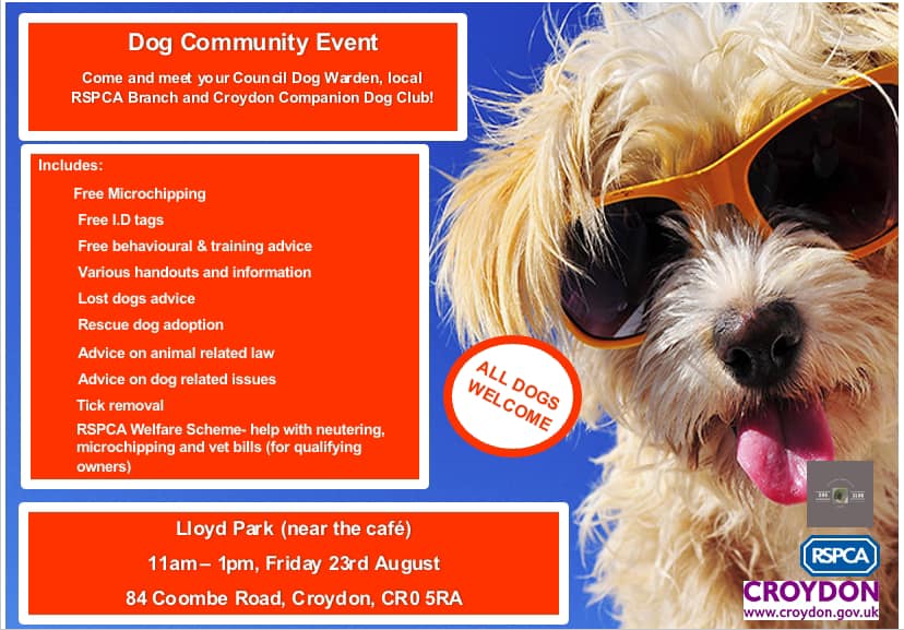FREE dog chipping, tick removal & advice 11am – 1pm Friday, 23 August near the cafe, Lloyd Park @yourcroydon @LloydParkCR0 Aug 19, 2024 · by eastcroydon · in Pets & Other Animals. · Share this: Share on X (Opens in new window) X Share on Facebook (Opens in new window) Facebook Share on Bluesky (Opens in new window) Bluesky Share on Nextdoor (Opens in new window) Nextdoor Like Loading... Related
