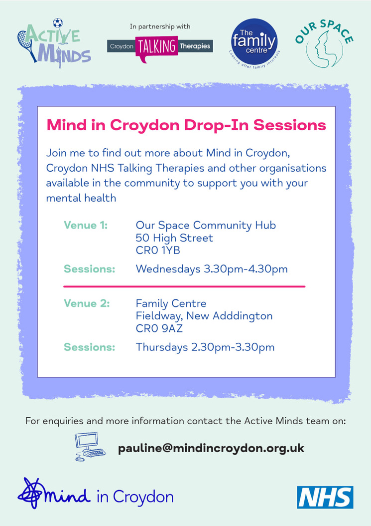 Find out about mental health support, drop-in sessions 3.30-4.30pm Wednesdays at Our Space, 50 High Street @MindinCroydon Aug 24, 2024 · by eastcroydon · in Health & Beauty. · More information about Mind in Croydon https://www.mindincroydon.org.uk Share this: Click to share on X (Opens in new window) X Click to share on Facebook (Opens in new window) Facebook Click to share on Bluesky (Opens in new window) Bluesky Click to share on Nextdoor (Opens in new window) Nextdoor Like Loading... Related