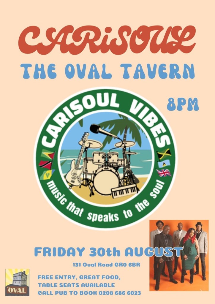 Carisoul Vibes 8pm Friday, 30 August @TheOvalTavern Aug 25, 2024 · by eastcroydon · in Sport & Leisure, Uncategorized. · Share this: Share on X (Opens in new window) X Share on Facebook (Opens in new window) Facebook Share on Bluesky (Opens in new window) Bluesky Share on Nextdoor (Opens in new window) Nextdoor Like Loading... Related