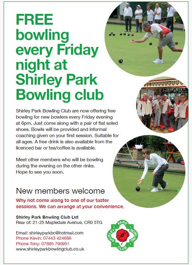 FREE bowling 6pm Fridays at Shirley Park Bowling Club, behind 21-25 Mapledale Avenue, off Addiscombe Road Aug 25, 2024 · by eastcroydon · in Sport & Leisure. · Share this: Click to share on X (Opens in new window) X Click to share on Facebook (Opens in new window) Facebook Click to share on Bluesky (Opens in new window) Bluesky Click to share on Nextdoor (Opens in new window) Nextdoor Like Loading... Related