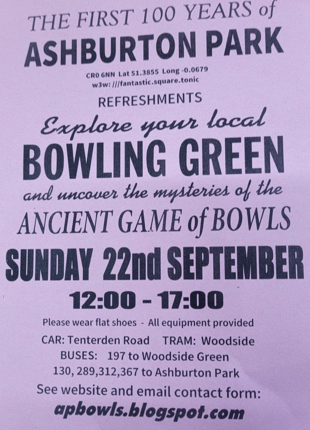 CANCELLED Community Fun Day & Bowling Club Centenary 12 – 5pm Sunday, 22 September in Ashburton Park @CHASEAddiscombe @AshburtonPark Sep 19, 2024 · by eastcroydon · in Family & Education, Sport & Leisure, Uncategorized. · Share this: Click to share on X (Opens in new window) X Click to share on Facebook (Opens in new window) Facebook Click to share on Bluesky (Opens in new window) Bluesky Click to share on Nextdoor (Opens in new window) Nextdoor Like Loading... Related