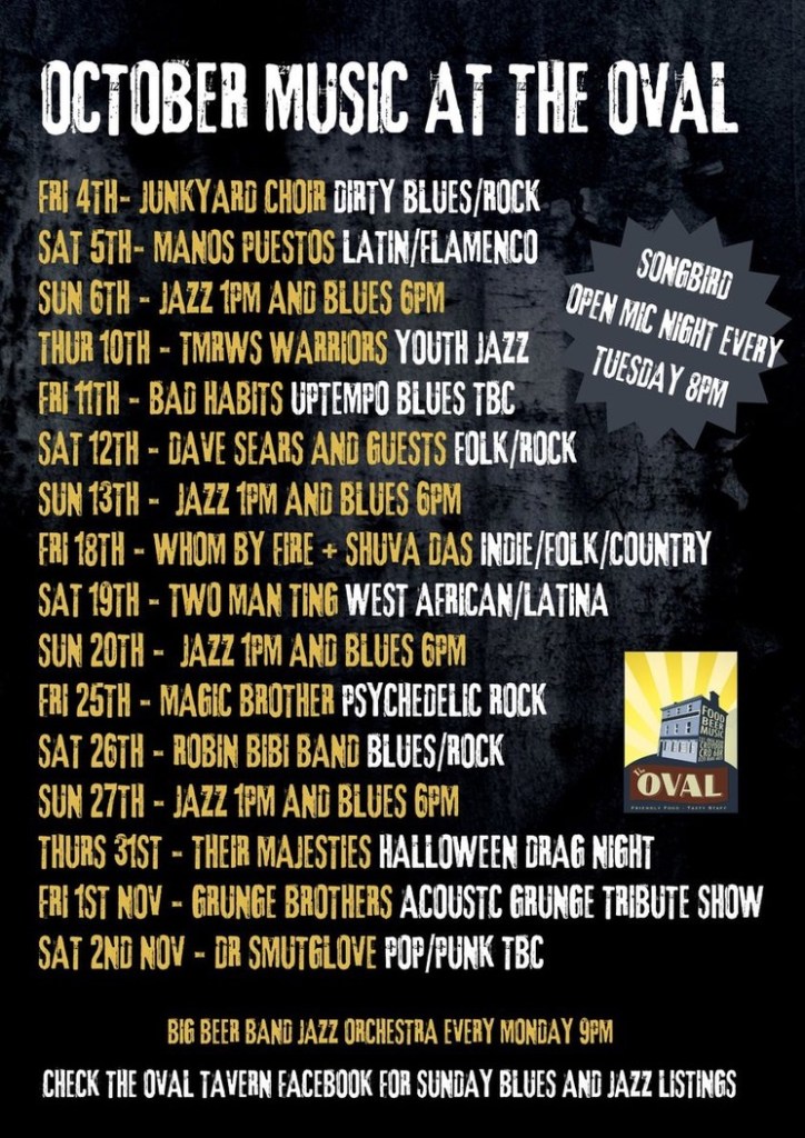Music in October @TheOval Tavern Sep 29, 2024 · by eastcroydon · in Sport & Leisure. · Share this: Click to share on X (Opens in new window) X Click to share on Facebook (Opens in new window) Facebook Click to share on Bluesky (Opens in new window) Bluesky Click to share on Nextdoor (Opens in new window) Nextdoor Like Loading... Related