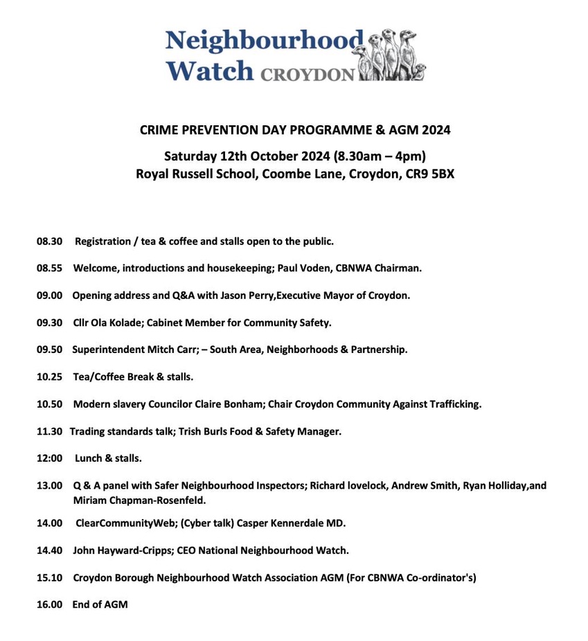Book your place at the Crime Prevention Day, 8.30am-4pm Saturday, 12 October at Royal Russell School, Coombe Lane @MPSAddiscombe Oct 7, 2024 · by eastcroydon · in Politics & Law. · Bookings my be made by 9 October to allow for catering preparations https://www.cbnwa.com Share this: Click to share on X (Opens in new window) X Click to share on Facebook (Opens in new window) Facebook Click to share on Bluesky (Opens in new window) Bluesky Click to share on Nextdoor (Opens in new window) Nextdoor Like Loading... Related