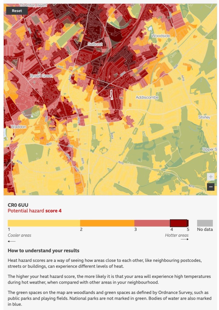 Street trees are important for many reason, including providing shade in hot weather. The map below is centred on Lebanon Road. The areas around Lower Addiscombe Road, Leslie Grove and Leslie Park Road are at the highest risk of experiencing extreme temperatures in hot weather.