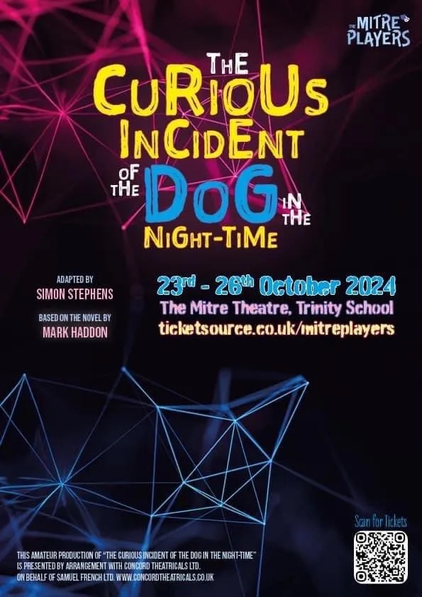A Curious Incident of a Dog in the Night 7pm Wednesday 23 – Friday 25 October, 2.30 & 5.30pm Saturday, 26 October at Trinity School, Addiscombe Road Oct 20, 2024 · by eastcroydon · in Sport & Leisure. · More information & bookings https://mitreplayers.org.uk/current-show/ Share this: Click to share on X (Opens in new window) X Click to share on Facebook (Opens in new window) Facebook Click to share on Bluesky (Opens in new window) Bluesky Click to share on Nextdoor (Opens in new window) Nextdoor Like Loading... Related