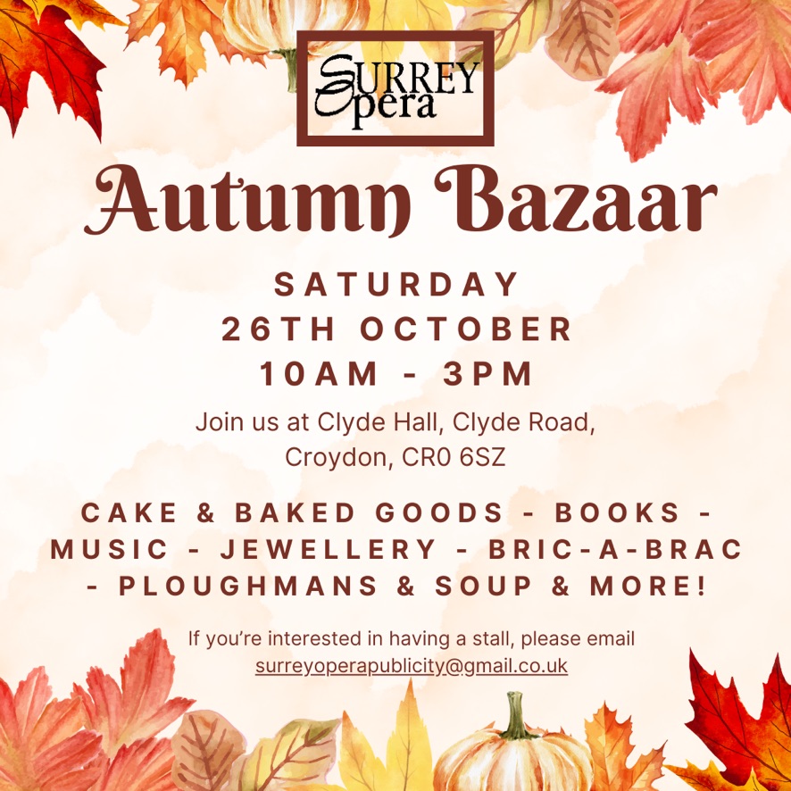 Autumn Bazaar 10am-3pm Saturday, 26 October at Clyde Hall, Clyde Road @SurreyOpera @CHASEAddiscombe @STMMMCroydon Oct 23, 2024 · by eastcroydon · in Shopping & Take-aways, Sport & Leisure. · Share this: Click to share on X (Opens in new window) X Click to share on Facebook (Opens in new window) Facebook Click to share on Bluesky (Opens in new window) Bluesky Click to share on Nextdoor (Opens in new window) Nextdoor Like Loading... Related
