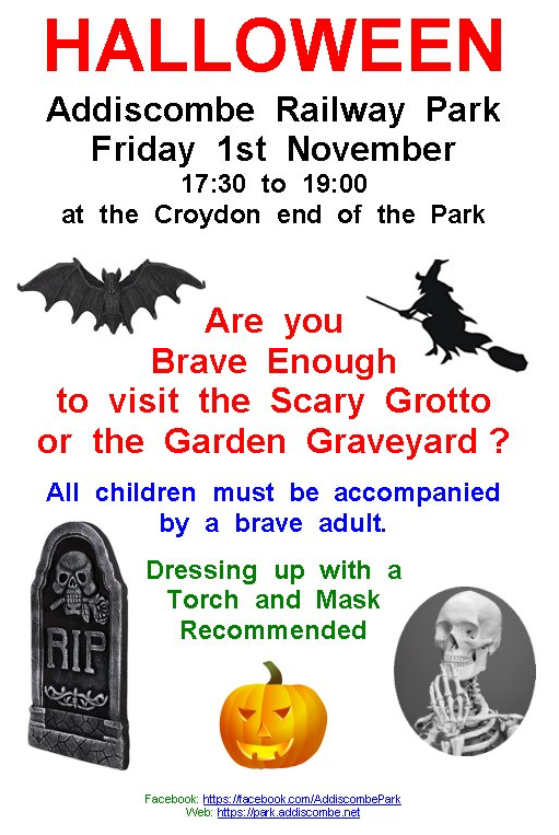 Halloween 5.30pm Friday, 1 November in Addiscombe Railway Park @CHASEAddiscombe @AddiscombePark Oct 29, 2024 · by eastcroydon · in Family & Education, Sport & Leisure. · Share this: Click to share on X (Opens in new window) X Click to share on Facebook (Opens in new window) Facebook Click to share on Bluesky (Opens in new window) Bluesky Click to share on Nextdoor (Opens in new window) Nextdoor Like Loading... Related