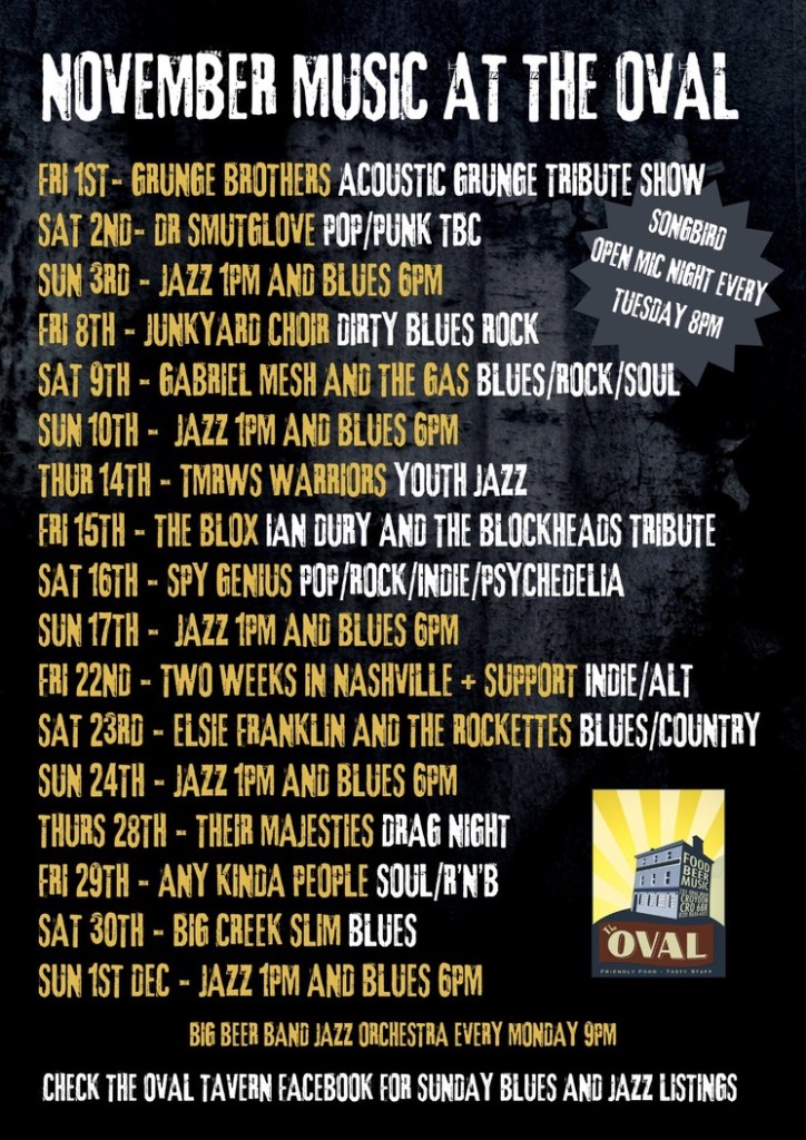 November music @TheOvalTavern Oct 31, 2024 · by eastcroydon · in Sport & Leisure. · Share this: Click to share on X (Opens in new window) X Click to share on Facebook (Opens in new window) Facebook Click to share on Bluesky (Opens in new window) Bluesky Click to share on Nextdoor (Opens in new window) Nextdoor Like Loading... Related