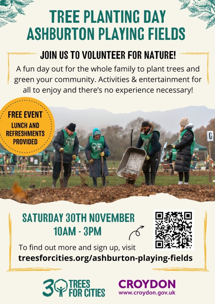 Help plant trees 10am – 3pm Saturday, 30 November in Ashburton Playing Fields @yourcroydon @AshburtonPark @CroydonClimateAction Nov 29, 2024 · by eastcroydon · in Environment & Recycling, Family & Education, Get Involved. · To register as a volunteer & form more information https://www.treesforcities.org/ashburton-playing-fields Share this: Click to share on X (Opens in new window) X Click to share on Facebook (Opens in new window) Facebook Click to share on Bluesky (Opens in new window) Bluesky Click to share on Nextdoor (Opens in new window) Nextdoor Like Loading... Related