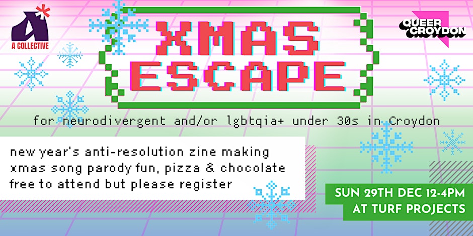 Xmas escape for neurodivergent and/or lgbtqia+ under 30s on 12pm Sunday, 29 December at Turf Projects, 46-47 Trinity Court, Whitgift Centre @Turf_Projects @QueerCroydon @centralewg