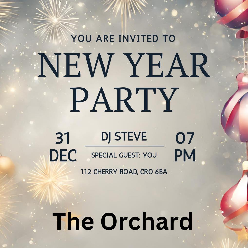 New Years Eve Party at 7pm, Tuesday 31 December at The Orchard, 112 Cherry Orchard Road Dec 28, 2024 · by eastcroydon · in Sport & Leisure. · Share this: Click to share on X (Opens in new window) X Click to share on Facebook (Opens in new window) Facebook Click to share on Bluesky (Opens in new window) Bluesky Click to share on Nextdoor (Opens in new window) Nextdoor Like Loading... Related