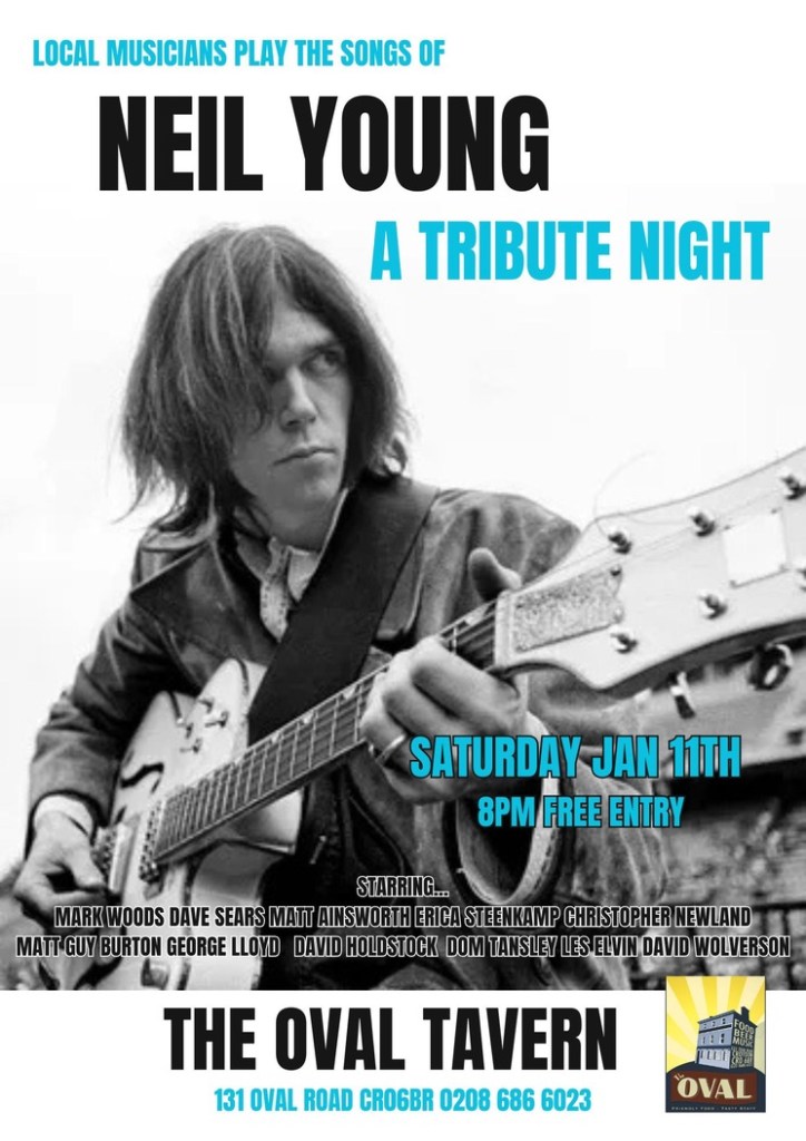Neil Young tribute night 8pm, Saturday 11 January @TheOvalTavern Jan 7, 2025 · by eastcroydon · in Sport & Leisure. · Share this: Click to share on X (Opens in new window) X Click to share on Facebook (Opens in new window) Facebook Click to share on Bluesky (Opens in new window) Bluesky Click to share on Nextdoor (Opens in new window) Nextdoor Like Loading... Related