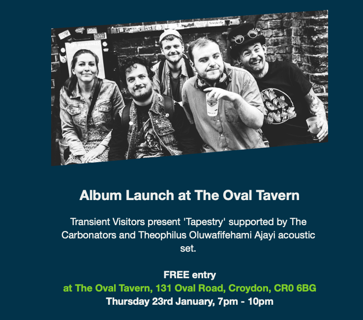 Transient Visitors, The Carbonators & Theophilus Oluwafifehami Ajayi 7pm Thursday, 23 January @TheOvalTavern @clubsodacroydon @croydonmencap Jan 17, 2025 · by eastcroydon · in Family & Education, Sport & Leisure. · Share this: Click to share on X (Opens in new window) X Click to share on Facebook (Opens in new window) Facebook Click to share on Bluesky (Opens in new window) Bluesky Click to share on Nextdoor (Opens in new window) Nextdoor Like Loading... Related