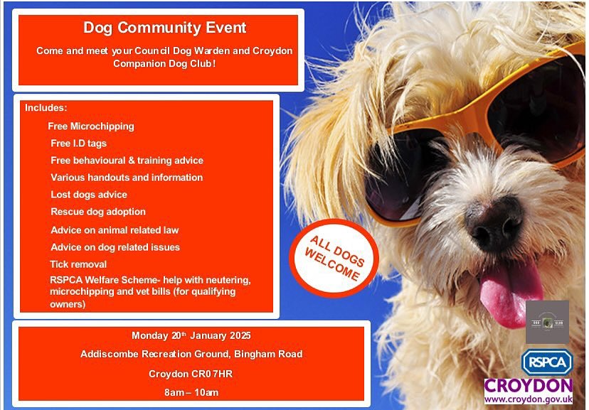 Dog community event 8 – 10am Monday, 20 January in Addiscombe Recreation Ground, Bingham Road @yourcroydon Jan 18, 2025 · by eastcroydon · in Pets & Other Animals. · Share this: Click to share on X (Opens in new window) X Click to share on Facebook (Opens in new window) Facebook Click to share on Bluesky (Opens in new window) Bluesky Click to share on Nextdoor (Opens in new window) Nextdoor Like Loading... Related